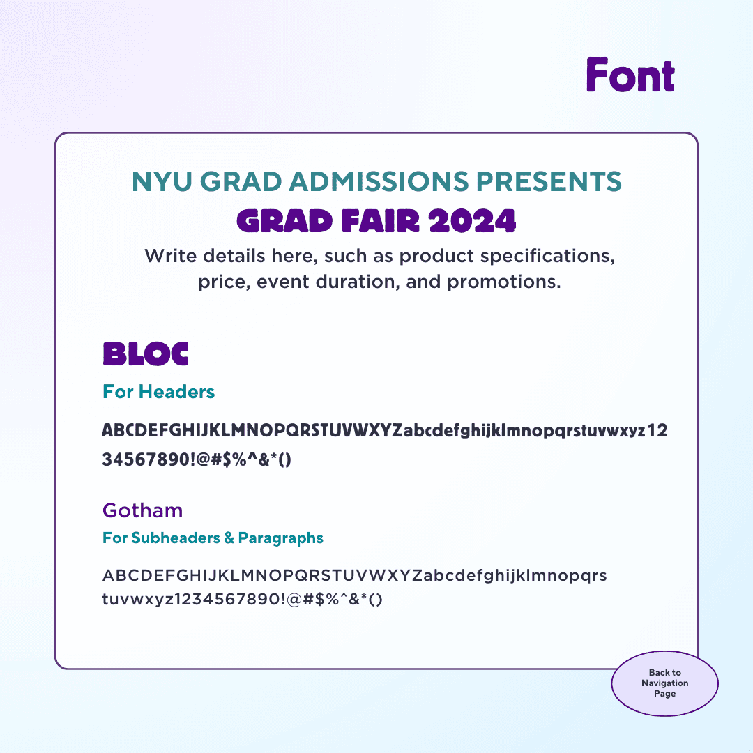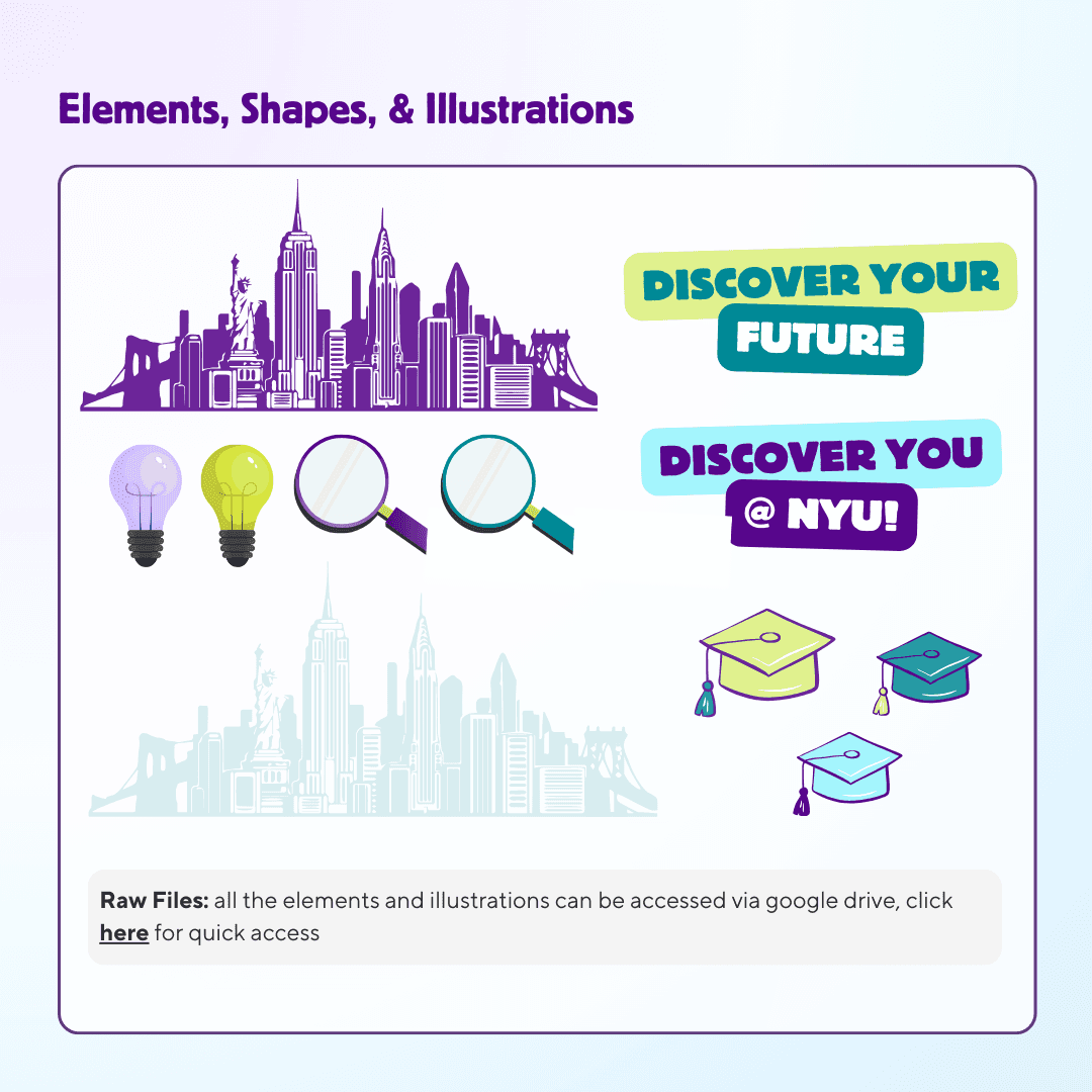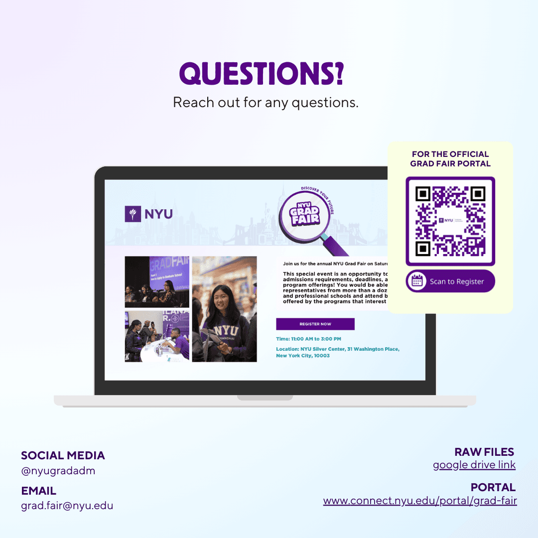 Led the visual direction for NYU's 2025 Graduate Fair — a flagship recruitment event connecting prospective students with programs across the university. Developed a cohesive brand system (logo, color palette, typography, graphic assets) packaged into a brand kit and distributed to partner schools for consistent cross-platform promotion. Designed and built the event portal and created multiple social content to drive engagement.